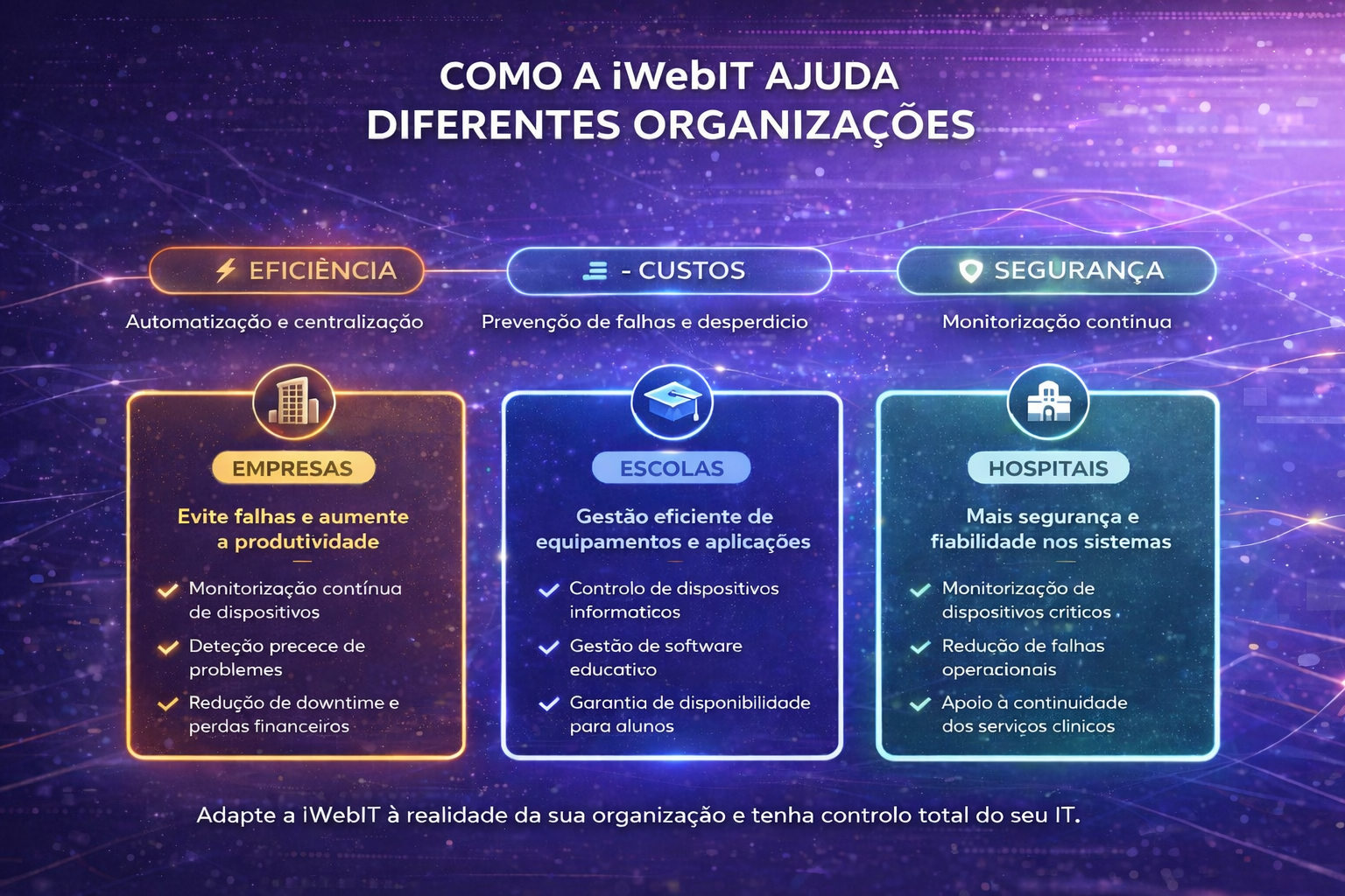 Desenvolvemos a plataforma iWebIT com base na experiência real no terreno, respondendo aos desafios do dia-a-dia das equipas técnicas: controlo de dispositivos, automatização de tarefas, gestão de atualizações e suporte remoto.